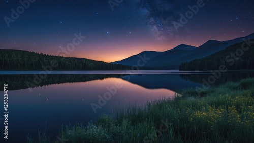 © DigitalDruid, Obraz premium Peaceful Night Landscape Reflecting Calm Lake Under Starry Sky and Mountains