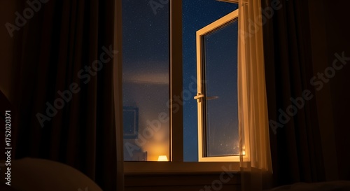 Obraz premium Peaceful Night View Through Open Window with Soft Light and Starry Sky - Cozy...