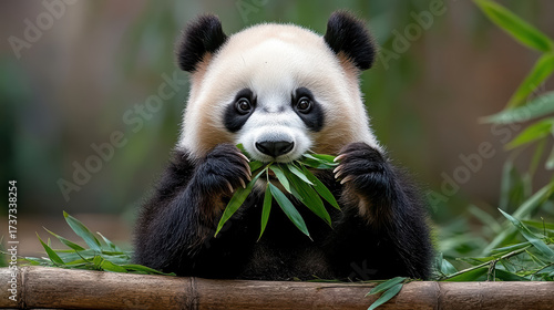 Fototapeta premium Peaceful panda eating bamboo leaves in serene forest setting, showcasing its...