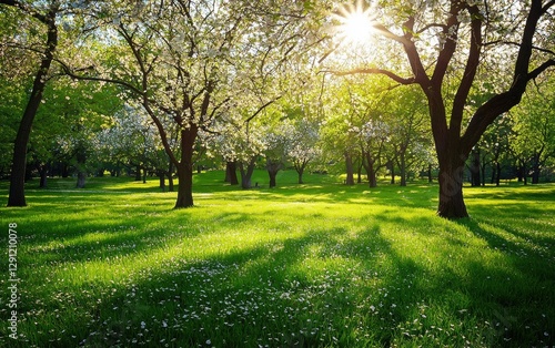 Naklejka premium Peaceful park with blossoming trees and fresh green grass