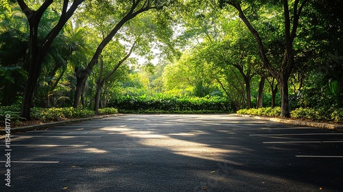 Naklejka premium Peaceful Parking Lot Under Lush Green Trees in Soft Natural Light