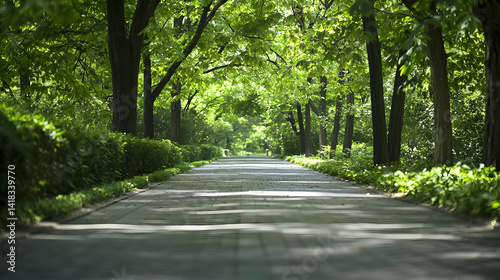 Naklejka premium Peaceful Pathway Through Lush Green Trees