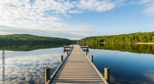 © nita, Naklejka premium Peaceful Perspective Down a Wooden Dock into a Calm, Reflective Wilderness Lake.