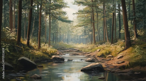 Obraz premium peaceful pine forest with a gentle stream flowing through it.