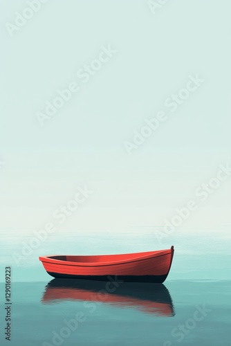 © afterfast, Naklejka premium Peaceful red boat on calm water, misty background