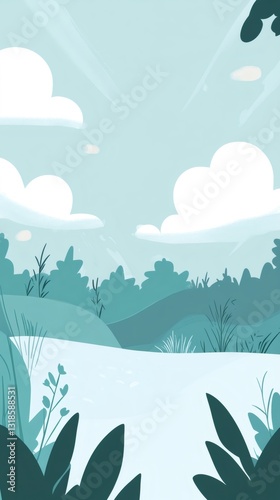 Obraz premium Peaceful river winding between verdant hills, serene sky with billowing white...