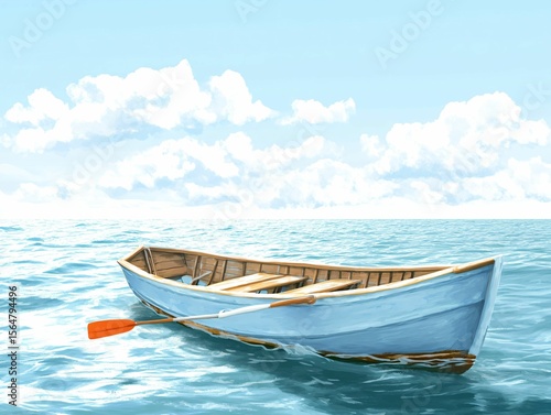 © op, Naklejka premium Peaceful Rowboat Drifting in Serene Open Water Under Blue Sky
