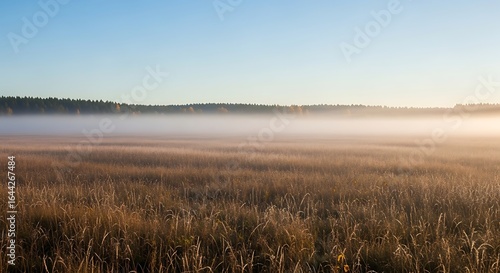 © Funni, Obraz premium Peaceful rural landscape of a golden wheat field enveloped in thick morning fog at sunrise.
