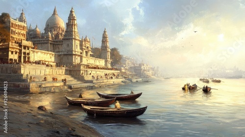 Naklejka premium Peaceful scene of the Ganges River with boats anchored by the shore, temple...