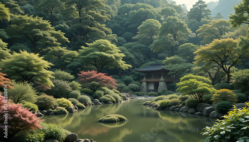 Fototapeta premium "Peaceful, serene, natural, Japanese garden landscape background"