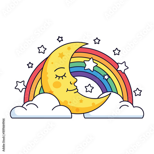 Fototapeta premium Peaceful Sleeping Crescent Moon with Rainbow, Stars, and Fluffy Clouds in a Dreamy Sky Illustration