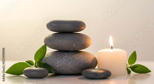 © Aurangzeb, Obraz premium Peaceful Spa Setting with Stones, Candle, and Leaves