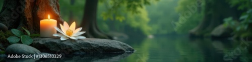 © Manae, Fototapeta premium peaceful stone landscape with lit candle and white lily amidst trees, calm, peaceful