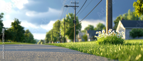 Naklejka premium peaceful suburban scene featuring sidewalk lined with grass and wildflowers,...