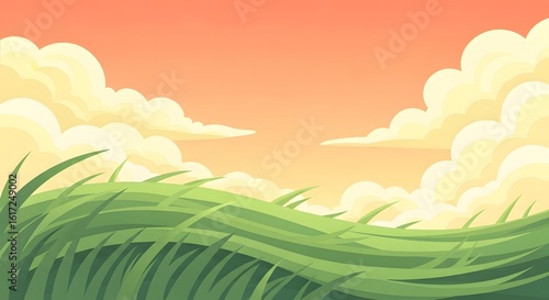 © Rendy, Obraz premium Peaceful summer meadow illustration with rolling hills and fluffy clouds at dusk
