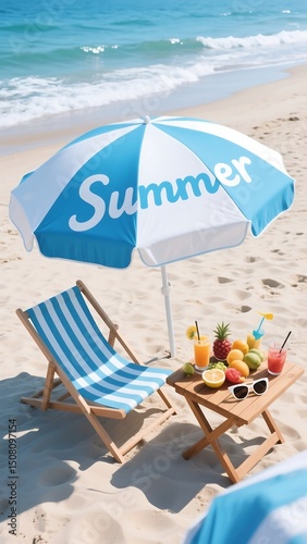 © xiang, Naklejka premium Peaceful summer vacation scene with blue sea and sky horizon, relaxing beach setting featuring colorful sun umbrella and empty lounge chairs on soft sand, symbolizing calm, leisure