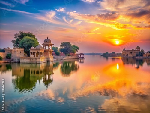 Fototapeta premium Peaceful Sunrise at Gadisar Lake, Jaisalmer, India - Soft Focus Portrait...