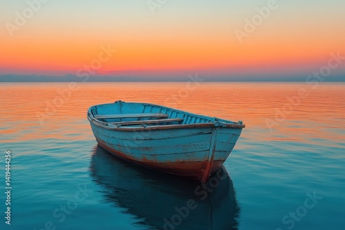 © Rania, Naklejka premium Peaceful sunrise, old boat floats on calm lake