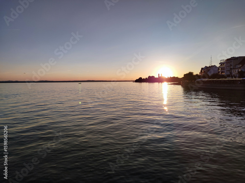 Naklejka premium Peaceful sunrise over a wide lake, soft reflections shimmering on the water.