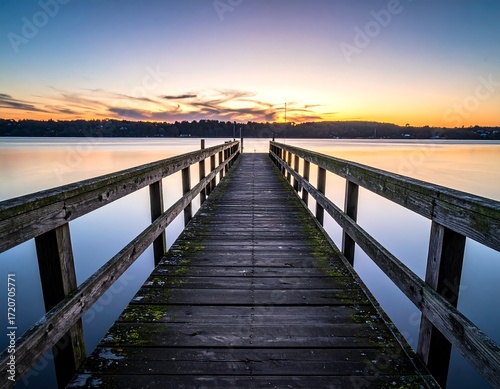 © jilbab, Naklejka premium Peaceful sunrise over a wooden pier