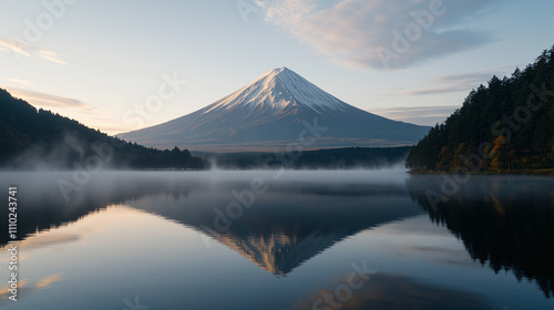 © Kevin, Fototapeta premium Peaceful Sunrise Over Mount Fuji and Calm Waters