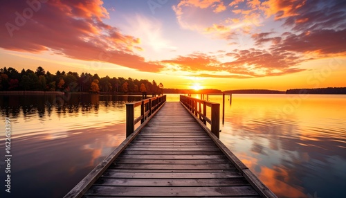 © Mugo, Obraz premium Peaceful sunrise over tranquil lake and wooden dock