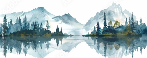© Rattana, Naklejka premium Peaceful Sunrise: Watercolor Mountain Landscape with Trees and Lake on White Background for Copy Space
