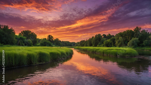 © FARDIN CREATIONS, Obraz premium Peaceful Sunset on a Serene River with a Rowboat, ai generated