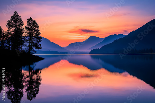 © Zape, Fototapeta premium Peaceful sunset over a calm lake with reflections of trees and mountains