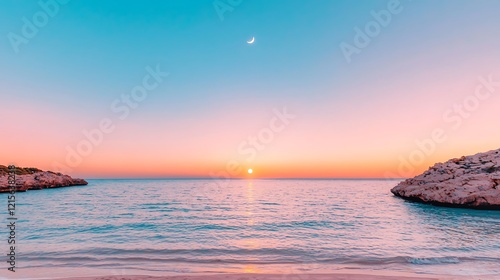 Naklejka premium Peaceful sunset over ocean rocks, calm beach scene, idyllic vacation