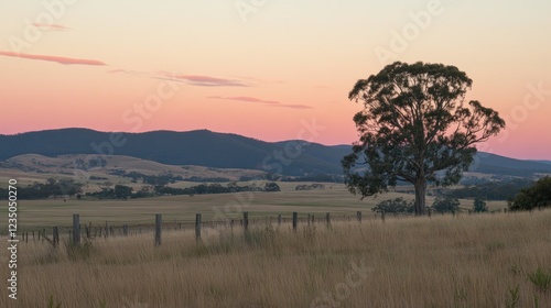 © Biancaart, Obraz premium Peaceful Sunset Over Rolling Hills and Lone Tree