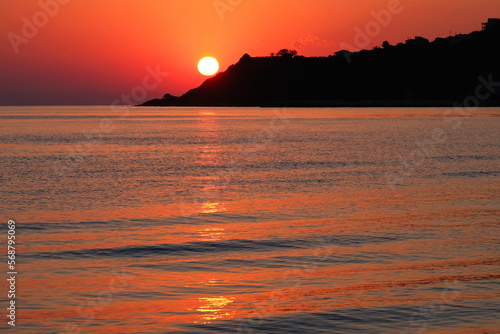 Naklejka premium Peaceful sunset with red sky, sea and mountains