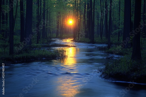 © AgungRikhi, Obraz premium Peaceful Swamp Sunset: Golden Light Reflecting on Calm Water Surrounded by Trees