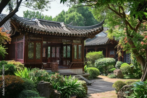 Obraz premium Peaceful traditional chinese garden with intricate pavilion and lush greenery