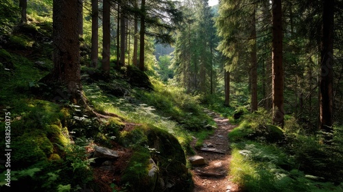 Fototapeta premium Peaceful Trail Through Dense Forest with Dappled Sunlight