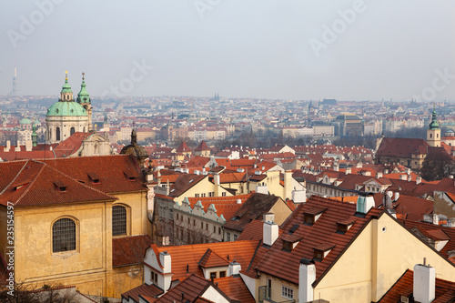 Fototapeta premium Peaceful view of Mala Strana in Prague with red tiled roofs and the baroque church of Saint Nicholas