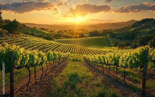 © Sergey Fedchenko, Naklejka premium Peaceful vineyard overlooking rolling hills under a golden sunset