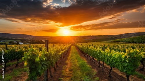 Fototapeta premium Peaceful vineyard with rows of grapevines during sunset