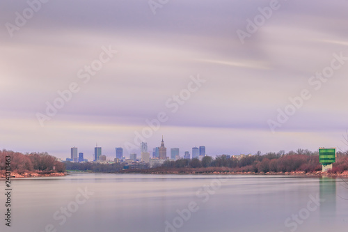 Naklejka premium Peaceful Warsaw skyline with view of the skyscrapers in the downtown at the end of the shorlines of the Vistula River in pastel colors