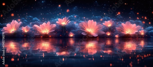 Fototapeta premium Peaceful water lily blooms reflecting on tranquil water surface with glowing lights for serene nature and celebration backgrounds.