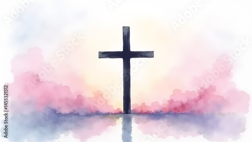 Obraz premium Peaceful watercolor cross against pastel dawn sky. Soft pink, blue, and...