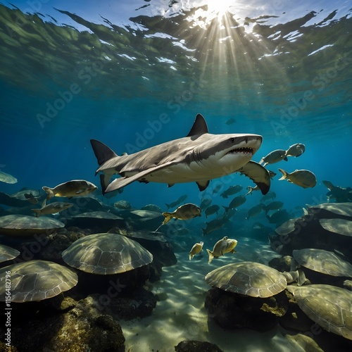Fototapeta premium Peaceful Waters: Northern River Shark and River Turtles Thriving Together in...