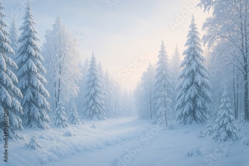 Fototapeta premium Peaceful winter forest landscape with snow-covered trees under soft morning...