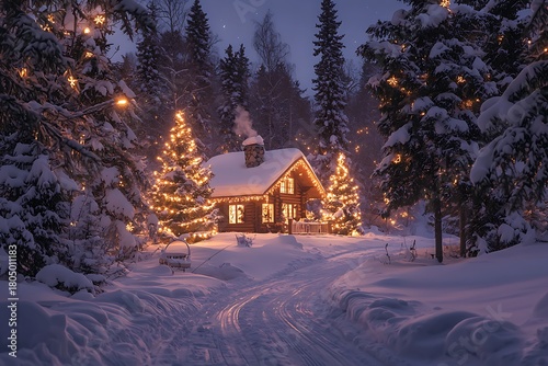 Naklejka premium Peaceful winter retreat featuring glowing cabin windows and sparkling snowy trees image
