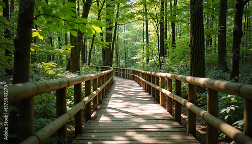 © Nadya, Obraz premium Peaceful wooden pathway through a lush green forest