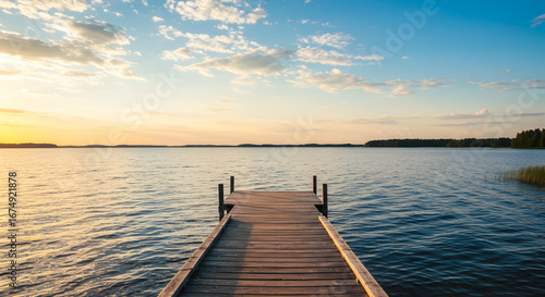 © mest selda blessun, Fototapeta premium Peaceful Wooden Pier on Calm Lake at Golden Hour. Tranquil Nature Landscape with Blue Sky and Clouds.