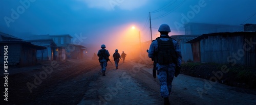 © ckybe, Fototapeta premium Peacekeeping forces bravely walking through fear and hope in a tense conflict zone.