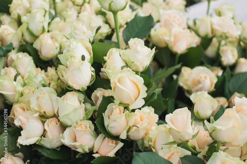 © Sergei, Obraz premium Peach Avalanche Rose Bush Background