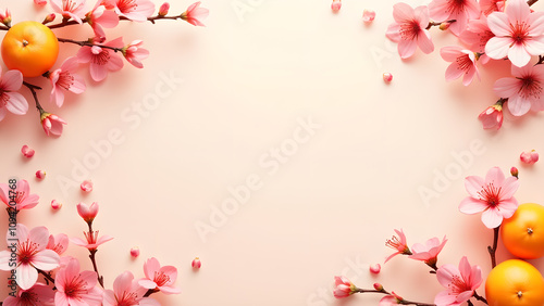 © ivanda, Fototapeta premium Peach blossom and tangerine frame on pastel background. Concept of Chinese New Year, spring, and celebration.