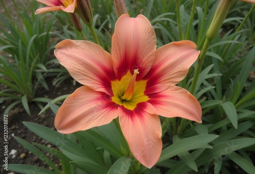 © Raka, Fototapeta premium Peach Daylily Blossom: A Serene Garden Jewel